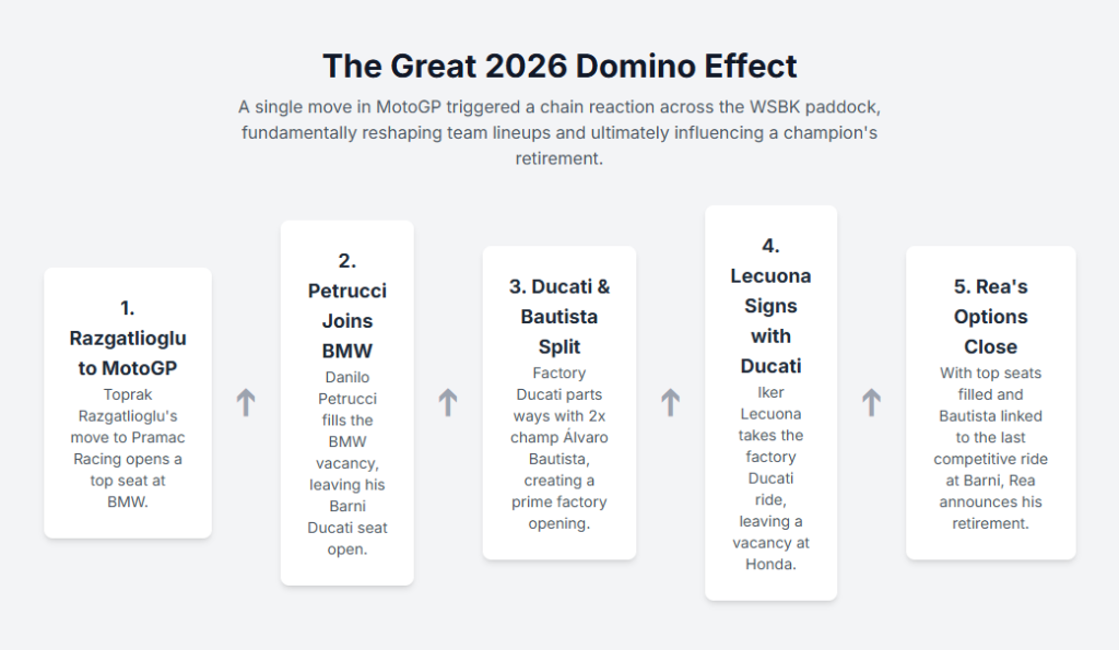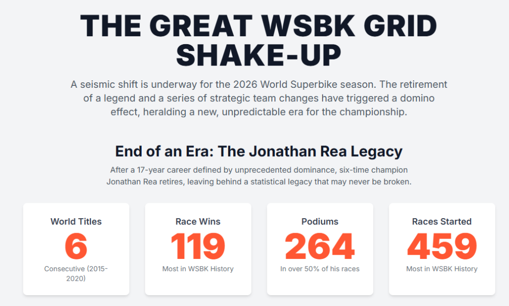 The recent, near-simultaneous announcements of six-time World Champion Jonathan Rea’s retirement and Iker Lecuona’s signing with Aruba.it Racing Ducati mark a seismic shift for the FIM Superbike World Championship. This report posits that these events are not isolated news items but rather the culmination of a complex “silly season” domino effect that is fundamentally reshaping the sport. Rea’s departure signals the end of an era of unprecedented individual dominance, while Ducati’s strategic decision to bring in Lecuona reflects a forward-looking approach focused on developing new talent and ensuring long-term financial stability. The confluence of these factors is ushering in a new, and potentially unpredictable, era for WSBK.