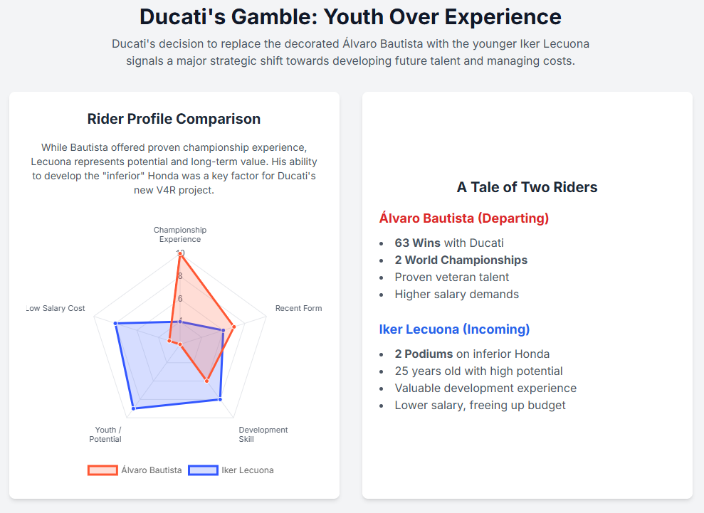 The signing of Iker Lecuona by Aruba.it Racing Ducati to replace two-time World Champion Álvaro Bautista is a defining moment for the Italian manufacturer. It represents a pivot from a strategy focused on proven, veteran talent to one that takes a calculated risk on a younger rider with significant, but unfulfilled, potential.