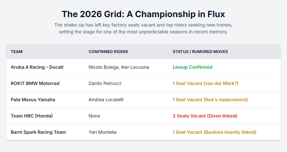 The cascade of transfers has left several key positions open on the 2026 grid, with a number of riders now searching for new homes.