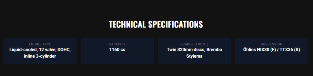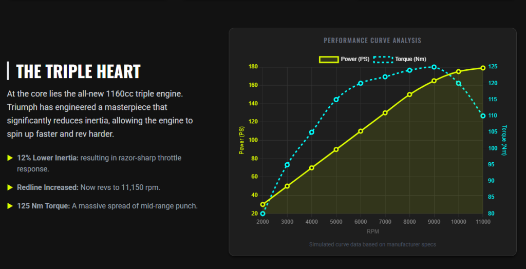 This new generation is defined by three core advancements: a substantial increase in engine output, a radical commitment to weight reduction, and the incorporation of class-leading electronic chassis management. The liquid-cooled, 1160 cc triple engine now delivers 177 HP, representing an approximate 29 HP increase over the previous 1050cc model.2 Simultaneously, the vehicle’s wet weight has been reduced by 10 kg , settling at just 198 kg ready to ride.2