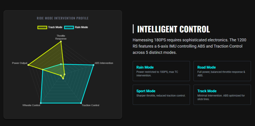 To provide tailored control over the bike’s performance parameters—including throttle map, TC sensitivity, ABS intervention, and Öhlins suspension damping—the 1200 RS offers five configurable riding modes: Rain, Road, Sport, Track, and Rider (customizable).1 The Rain mode significantly reduces the bike’s potential, capping peak power output at 100 HP.4