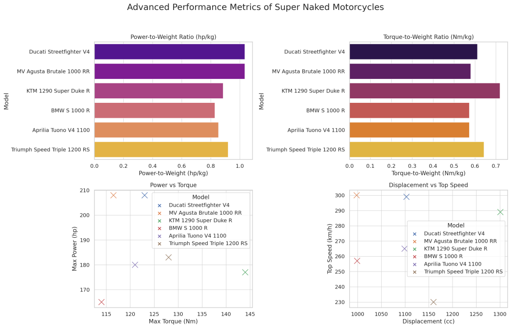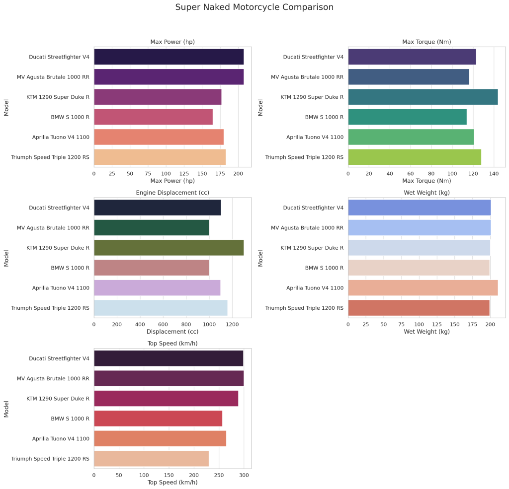 Visual comparison of the top super naked motorcycles using five key performance metrics:
