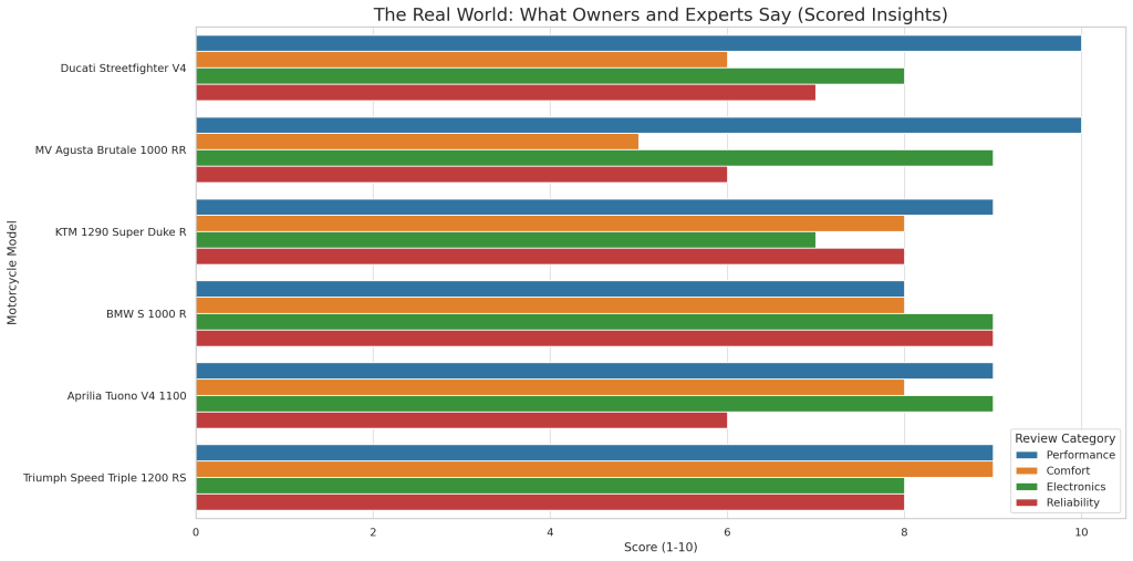 The KTM’s V-twin is described with a visceral “thumping” sensation , and the Aprilia’s V4 delivers a “wailing riot” of an exhaust note. This consistent focus on the sensory experience provided by each engine’s unique configuration suggests that the auditory and tactile feedback are primary drivers of desirability in this segment. The emotional response elicited by the engine’s personality, rather than just its quantitative output, plays a significant role in a rider’s connection with the machine.