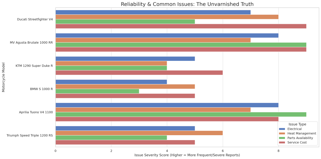 - BMW and Triumph show the lowest issue severity, especially in availability and electronics—highlighting their real-world dependability.