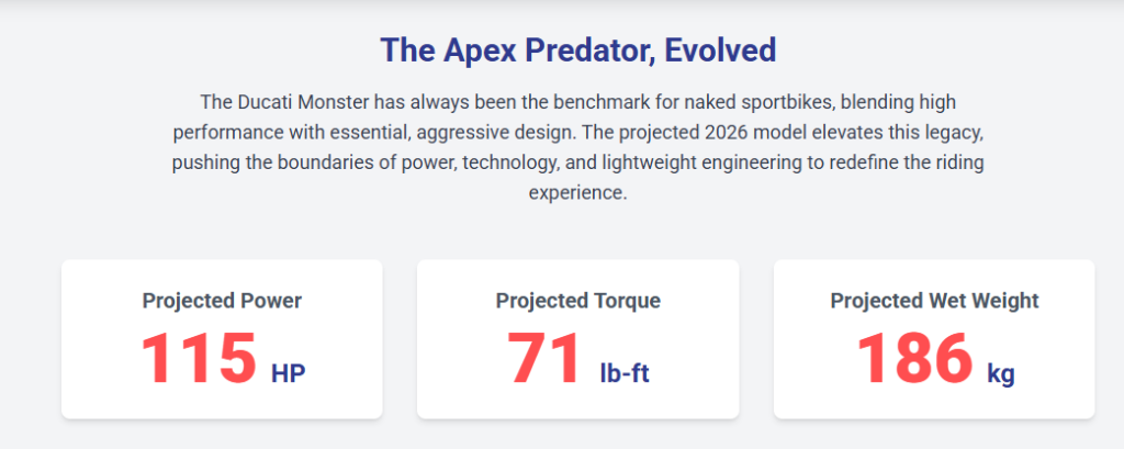 The outgoing 937cc Testastretta 11° engine provided a robust output of 111 horsepower (82 kW) delivered at 9,250 rpm, and a maximum torque of 69 lb-ft (93 Nm) peaking at 6,500 rpm.22 The 890cc V2 platform, as employed in other Ducati models, is capable of producing up to 120 horsepower (claimed).19 The conservative projection for the 2026 Monster V2 places peak output in the 115–120 horsepower range.5 Torque is anticipated to remain highly competitive, approximating the outgoing model’s 69 lb-ft.19