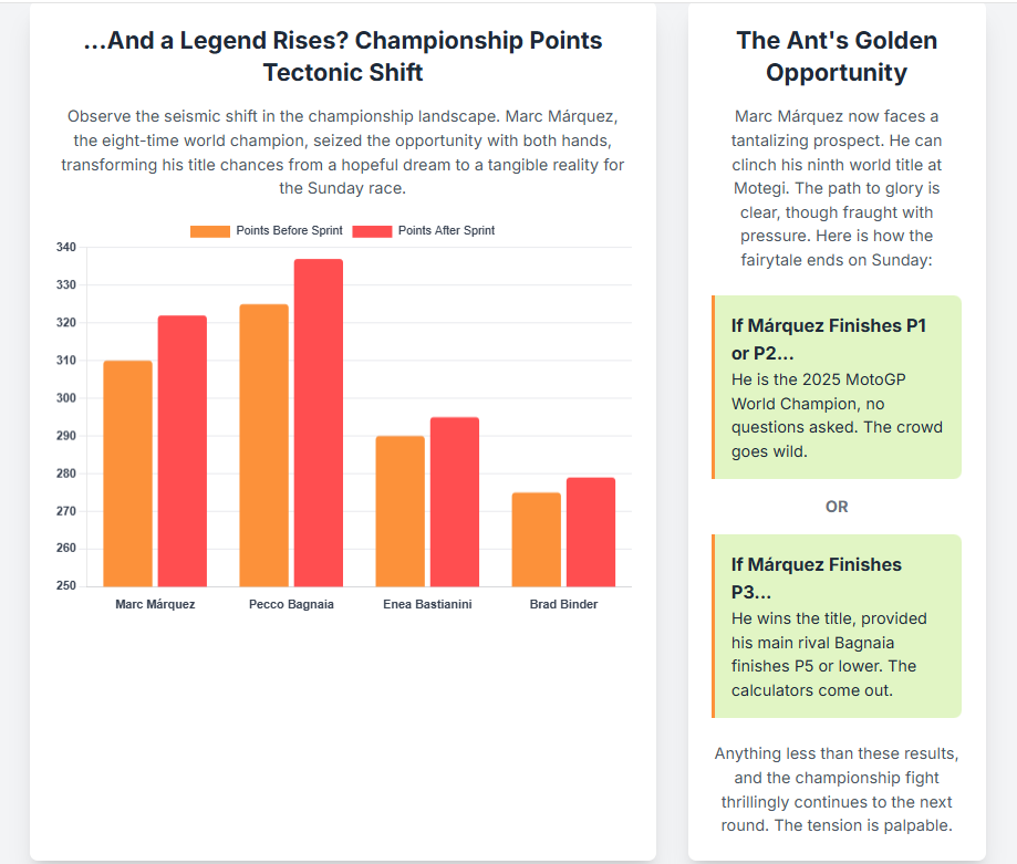 The Twin Ring Motegi circuit in Japan possesses a storied history of delivering pivotal and often crushing championship moments. This is hallowed ground for high-stakes decisions, having previously served as the stage for critical finales, including Casey Stoner’s 2007 coronation and the memorable 2010 duel between former teammates Valentino Rossi and Jorge Lorenzo.1 Entering the 2025 Japanese Grand Prix, the championship tension had already reached a near-breaking point, but the Saturday Sprint Race delivered a trio of events that instantly—and perhaps irrevocably—reshaped the power structure of the MotoGP season, setting the stage for an inevitable Sunday conclusion.