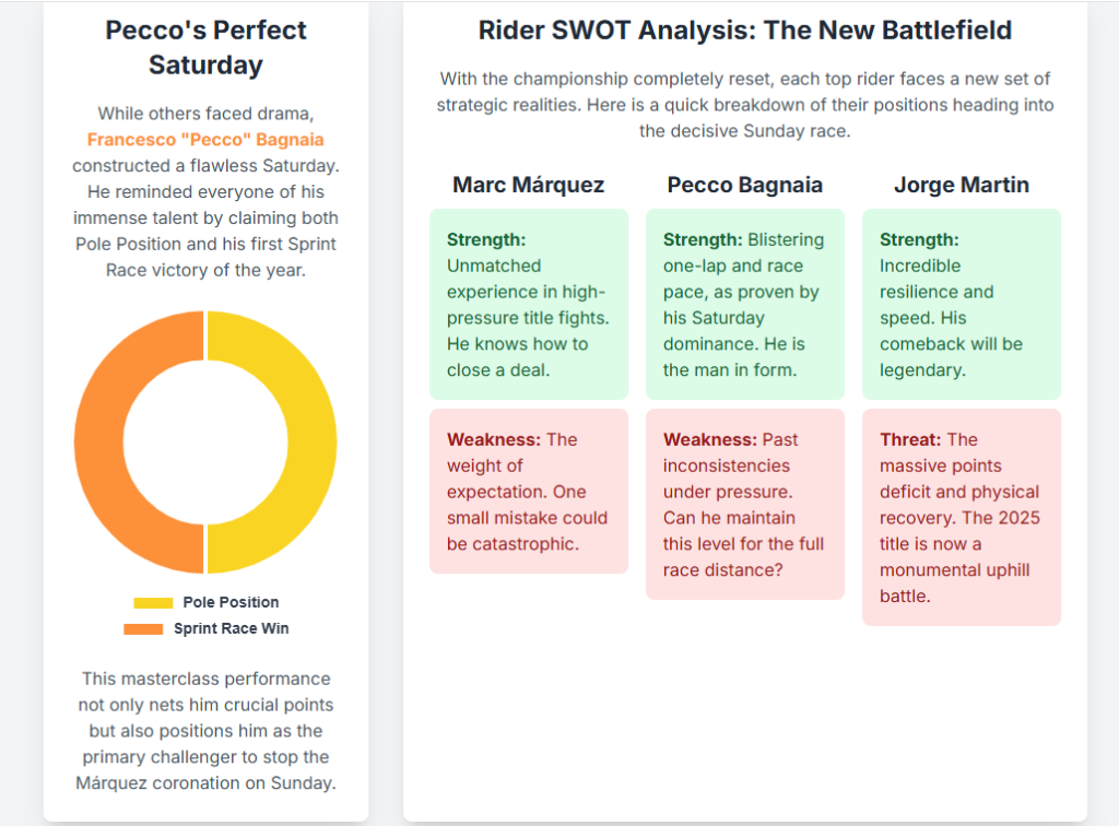 First, Francesco Bagnaia seized Pole Position, confirming his return to front-running pace after a mid-season slump. Second, Bagnaia converted that pole into his first Sprint victory of the season, a massive psychological triumph.3 Crucially, the third event turned high drama into catastrophe: reigning World Champion Jorge Martin suffered a disastrous Turn 1 crash, confirming a broken collarbone that immediately ruled him out of competition.5
