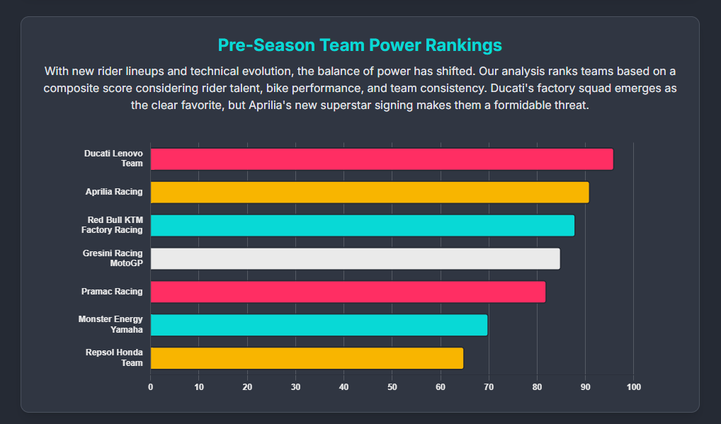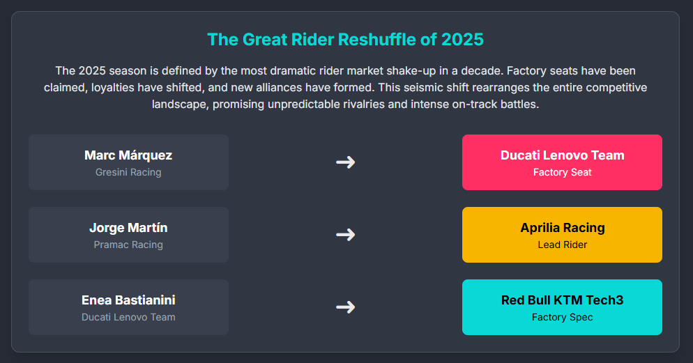 The structural reorganization involving Prima Pramac Racing and Yamaha constitutes a major competitive shift. Pramac, following its departure from Ducati after a championship-winning partnership, became the new Yamaha satellite team.18 This move immediately bolsters Yamaha’s capacity for gathering development data and sets the stage for a new competitive alignment. This strategic transition was immediately followed by significant rider market activity.