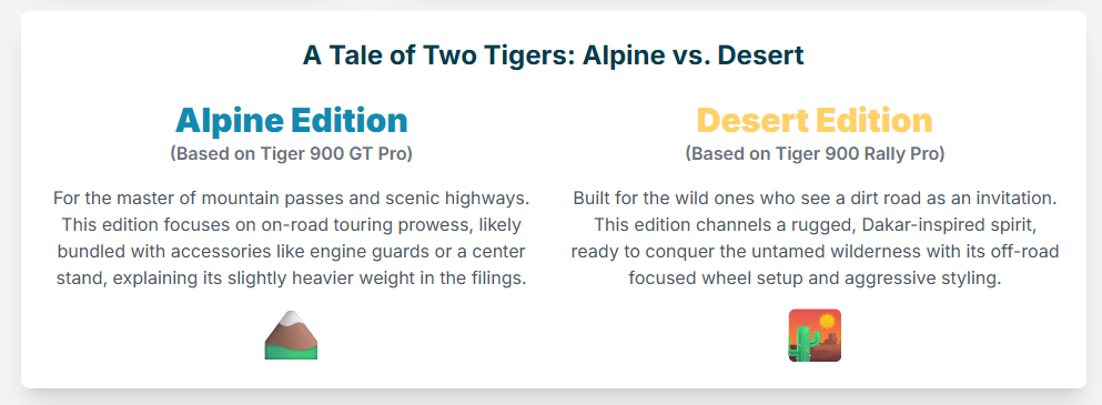 | Feature | Tiger 900 GT Pro | Alpine Edition (Speculative) | Tiger 900 Rally Pro | Desert Edition (Speculative) |