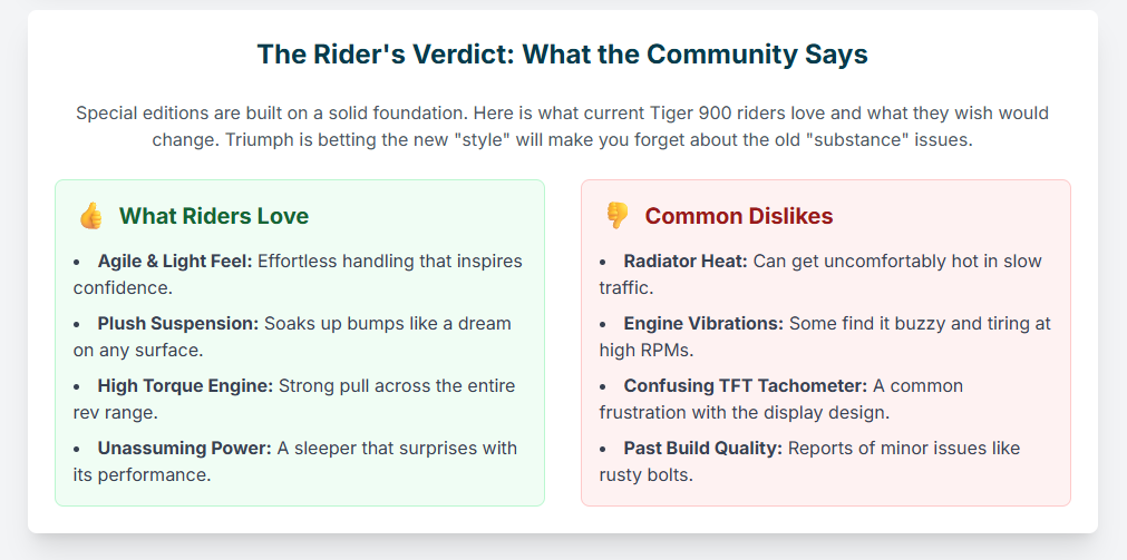 The ultimate test for any special edition is how it resonates with the riders. The Tiger 900 platform, which serves as the canvas for these new editions, has garnered strong opinions from the community. Riders express great affection for the bike’s character and performance. They celebrate its light and agile feel, even in heavy city traffic, and its unassuming yet powerful engine.27 The bike’s handling is described as effortless, inspiring confidence on both paved roads and light trails. The suspension is praised for its plushness and ability to handle bumps, bumps, and potholes, making it an “absolute dream to ride”.27 The engine, with itshigh torque feel across the rev range, is a highlight for many.28