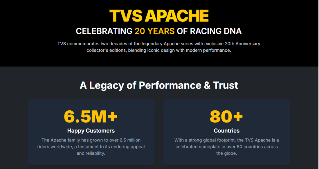 - How the TVS Apache Crossed the 5-Million Sales Milestone, accessed on September 7, 2025, https://www.tvsmotor.com/media/blog/how-the-tvs-apache-crossed-the-5-million-sales-milestone
