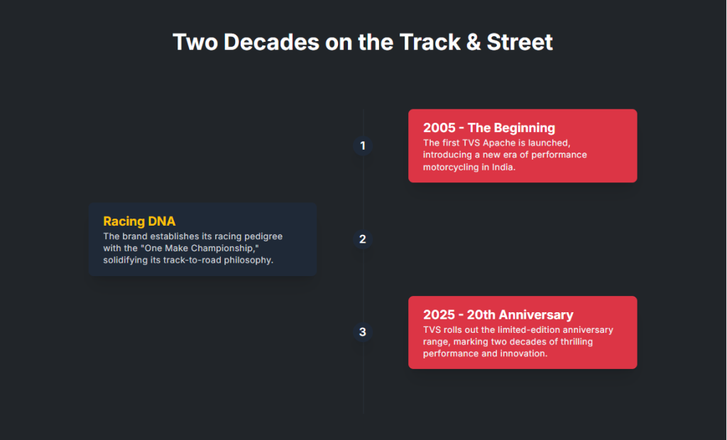 - 20 years of TVS Apache: Timeline explained | Hindustan Times, accessed on September 7, 2025, https://www.hindustantimes.com/car-bike/20-years-of-tvs-apache-timeline-explained-101756798146130.html
