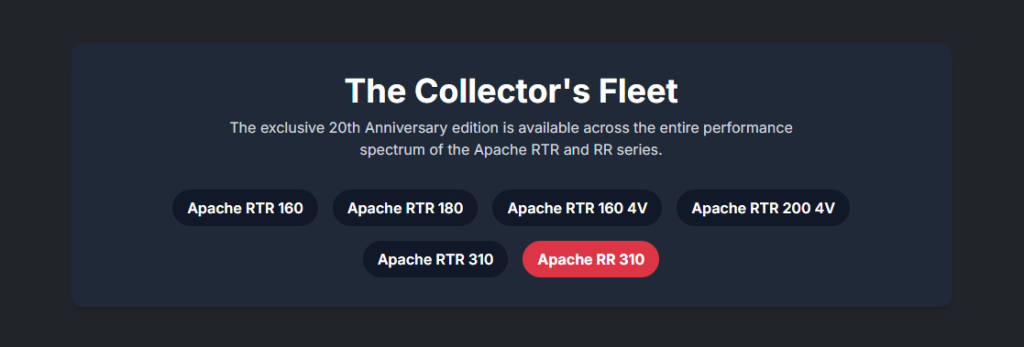 First, a series of Limited Anniversary Editions have been released for the entire Apache lineup, including the Apache RTR 160, Apache RTR 180, Apache RTR 160 4V, Apache RTR 200 4V, Apache RTR 310, and Apache RR 310.1 These models are primarily defined by their cosmetic appeal, featuring an exclusive black-and-champagne-gold paint scheme, dual-tone alloy wheels, and a dedicated 20-year Apache logo.1 The objective of this range is to create a sense of exclusivity and capitalize on brand sentiment, positioning them as “true collector’s editions for enthusiasts”.1