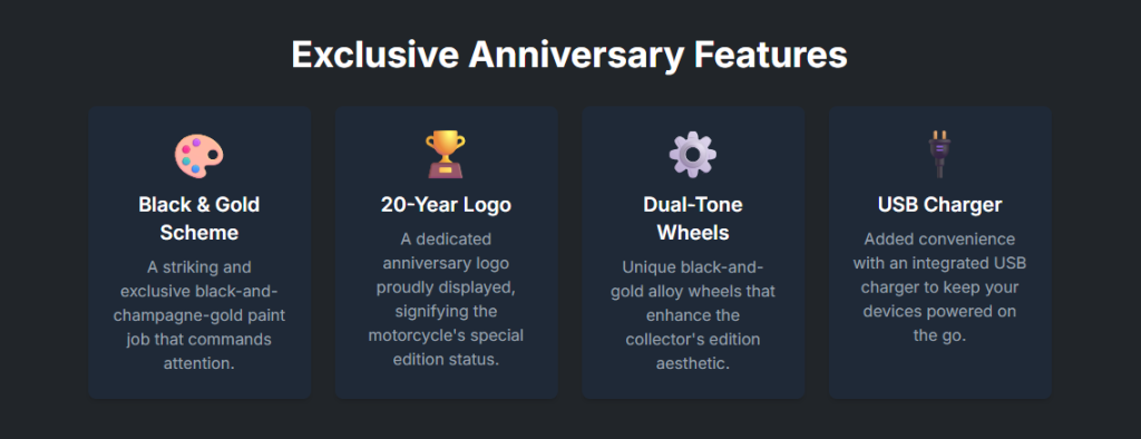 The primary value proposition of the Limited Anniversary Editions is their exclusive aesthetic appeal. The series is defined by a striking black-and-champagne-gold livery, which provides a cohesive visual theme across the entire range.2 This celebratory look is further enhanced by dual-tone black-and-gold alloy wheels and a special 20-year commemorative logo on the fuel tank.1