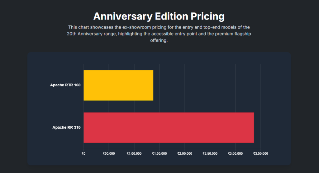 The pricing strategy for the new variants demonstrates a clear monetization of brand loyalty and technological demand. The anniversary editions, with their primarily cosmetic updates, still command a price premium over standard models, which varies by model and is particularly significant for the higher-capacity bikes.13 For example, the anniversary RTR 160 is ₹3,670 more expensive than its standard counterpart, while the premium for the RR 310 anniversary edition is a considerable ₹42,001 over the top-end variant with BTO kits.13 This tiered premium pricing suggests that TVS is targeting different levels of brand affinity, with the highest-priced models aimed at affluent collectors who are willing to pay for exclusivity and symbolic value.