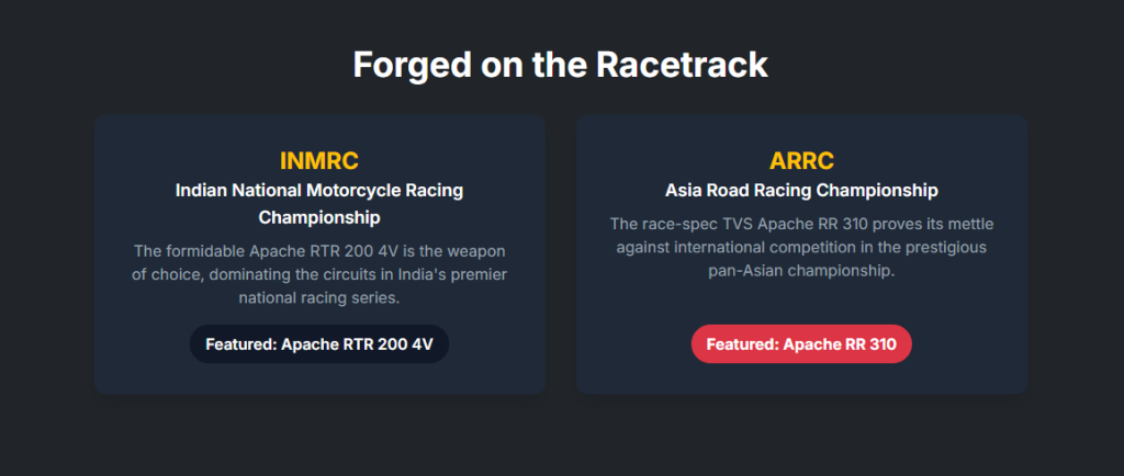 TVS Motor Company has a long-standing history in motorsports, with its factory racing team, TVS Racing, established in 1982.5 This racing heritage is not merely a marketing slogan but a fundamental pillar of the Apache brand’s engineering and development. TVS uses racing as a rigorous testbed for its technology, with features such as the “Race-Tuned Slipper Clutch” and “Race-Tuned SHOWA Monoshock” being direct results of its competition experience.16 The engine of the RTR 160 4V, for instance, is derived from the “7-time INMRC winning RTR 165 prototype”.17 This lineage provides a credible foundation for the brand’s “Racing DNA” narrative.