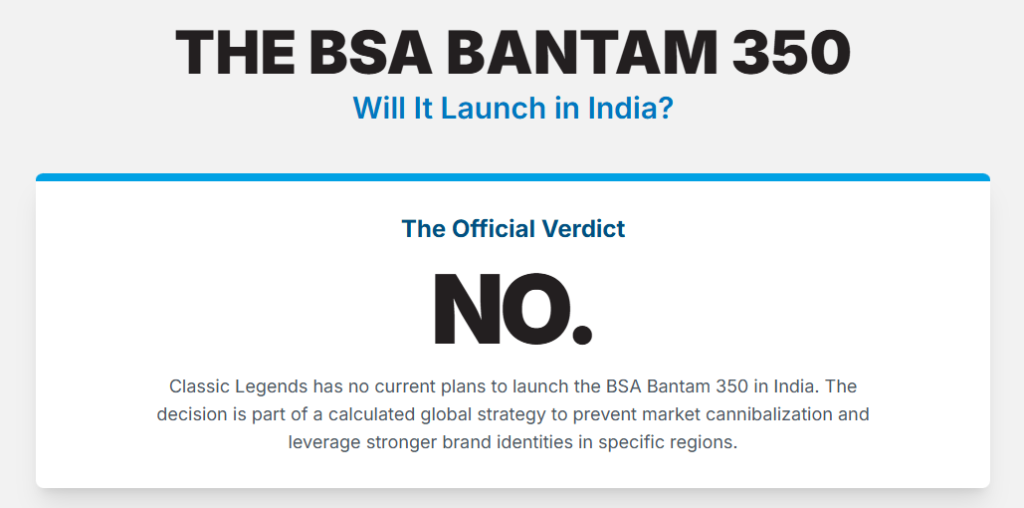 Based on a comprehensive analysis of available information, the BSA Bantam 350 is definitively not slated for launch in the Indian market in the foreseeable future. This decision is a cornerstone of Classic Legends’ deliberate brand and market segmentation strategy.