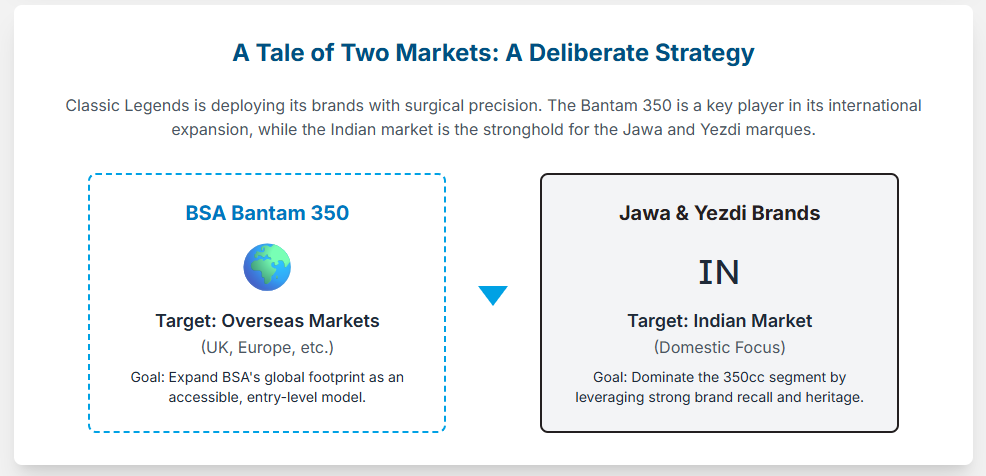 A crucial factor influencing this decision is that “the BSA name doesn’t have the same widespread brand recall as the Yezdi and Jawa brands do in India”.1 While BSA has a rich global history, its brand recognition in contemporary India is significantly lower compared to the deeply entrenched nostalgic appeal of Jawa and Yezdi. Launching a new 350cc model under a less-recognized brand in a highly competitive segment would pose significant marketing and sales challenges. The Bantam 350 is a key component of BSA’s strategy to expand its international portfolio. Its launch is intended to diversify BSA’s product offerings, making them more accessible and enhancing overall market penetration specifically in overseas markets.6 This indicates a clear strategic division of labor for the brands within Classic Legends’ global portfolio, with BSA primarily targeting non-Indian markets for this particular model.