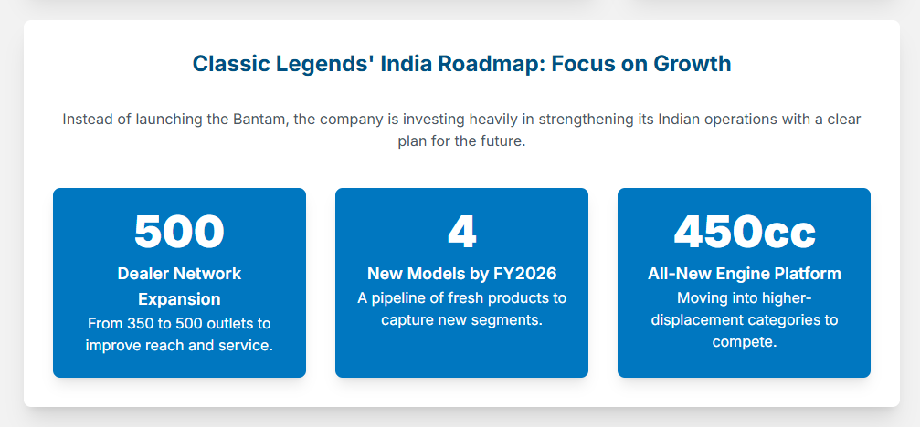 Classic Legends’ broader strategic direction in India involves consolidating and expanding its presence through the refinement of existing Jawa and Yezdi models, a significant dealer network expansion, and the introduction of distinct new models, including a new 450cc platform, by FY2026.4 BSA’s role is primarily to drive international market penetration and diversify the company’s global portfolio with models like the Bantam 350, while its Indian presence is focused on more premium, higher-displacement offerings.