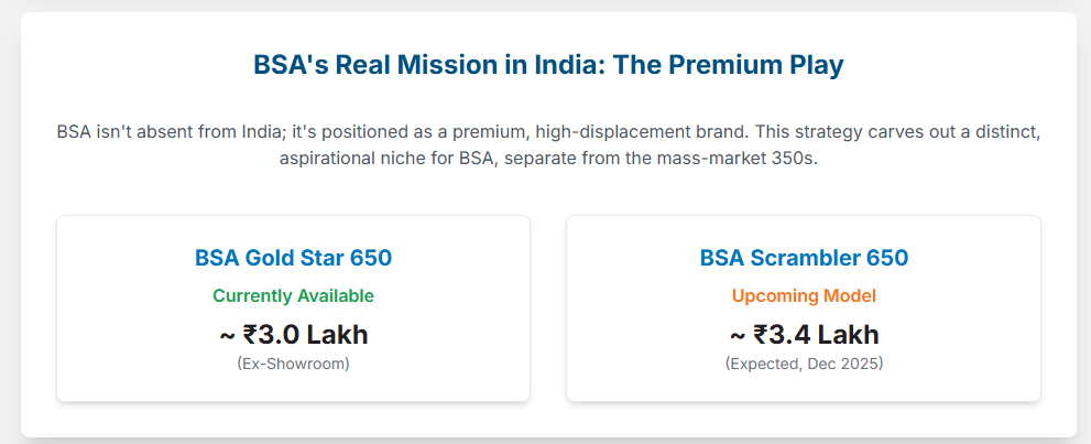 A direct factual contradiction exists between the statement in one piece of information 3 claiming BSA does not currently sell in India and the evidence from other sources 9, which clearly show the BSA Gold Star 650 is available and a dealer network exists. The statement about BSA not selling in India might be a historical or generalized comment, perhaps implying BSA’s limited or re-established presence compared to its historical peak or compared to the more dominant Jawa/Yezdi brands in India. It is likely an oversimplification or outdated phrasing. This clarifies that BSA is indeed present in India, but its presence is highly strategic and selective. Classic Legends has chosen to introduce higher-displacement, more premium models (the 650cc Gold Star and the upcoming Scrambler) under the BSA brand in India. This suggests a deliberate strategy to build BSA’s image as a premium, aspirational brand in the Indian market, distinct from the more mass-market oriented 350cc segment that is already saturated with competition and Classic Legends’ own Jawa/Yezdi offerings. The Bantam 350, being an “entry-level” 1 and platform-shared model, does not align with this initial premium positioning for BSA in India. This selective approach aims to establish BSA’s brand equity in India without diluting its premium appeal or directly competing with its own sister brands in a crowded segment.