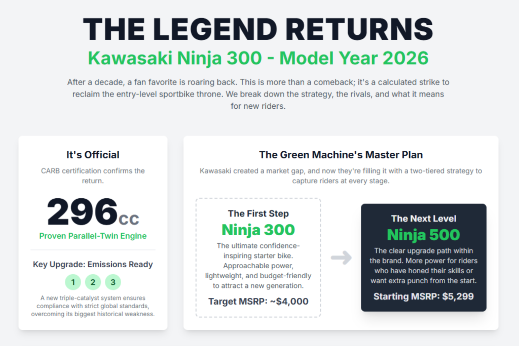 1. Kawasaki Is Bringing Back the Ninja 300 | Motorcycle.com, accessed on August 20, 2025, https://www.motorcycle.com/bikes/new-model-preview/kawasaki-is-bringing-back-the-ninja-300-44646367