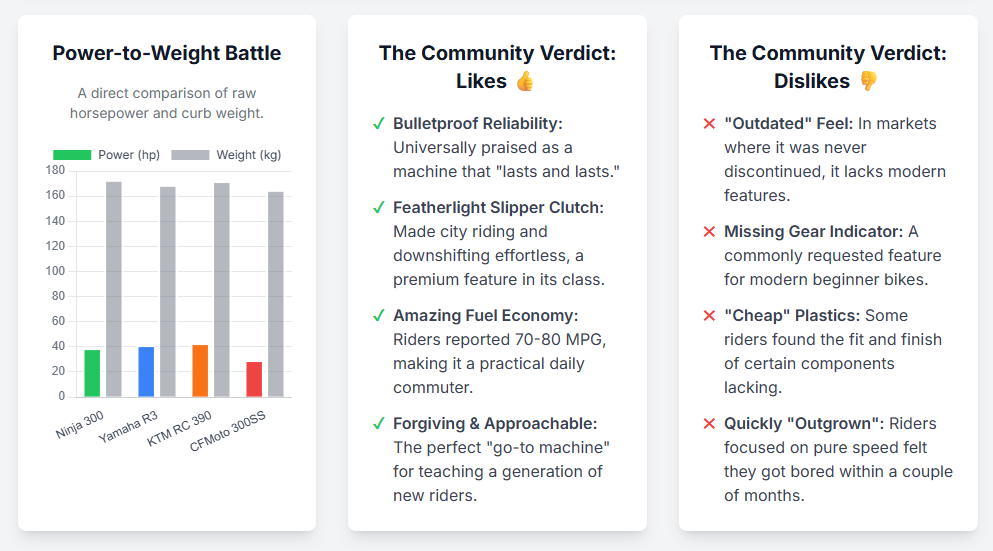 10. Ninja 300 – Enough to keep me excited? : r/motorcycles – Reddit, accessed on August 20, 2025, https://www.reddit.com/r/motorcycles/comments/2652gj/ninja_300_enough_to_keep_me_excited/