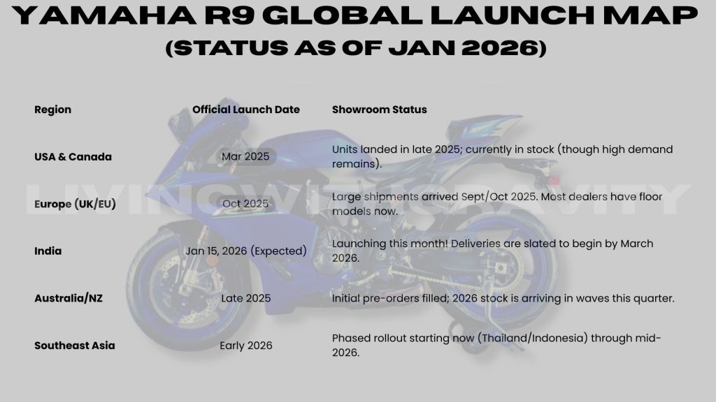 In North America and Europe, the R9 technically debuted in late 2024 as a “2025 model.” While a few lucky riders got their hands on them in late 2025, right now (Q1 2026) is when major showroom stock is finally stabilizing and becoming available for walk-in buyers.